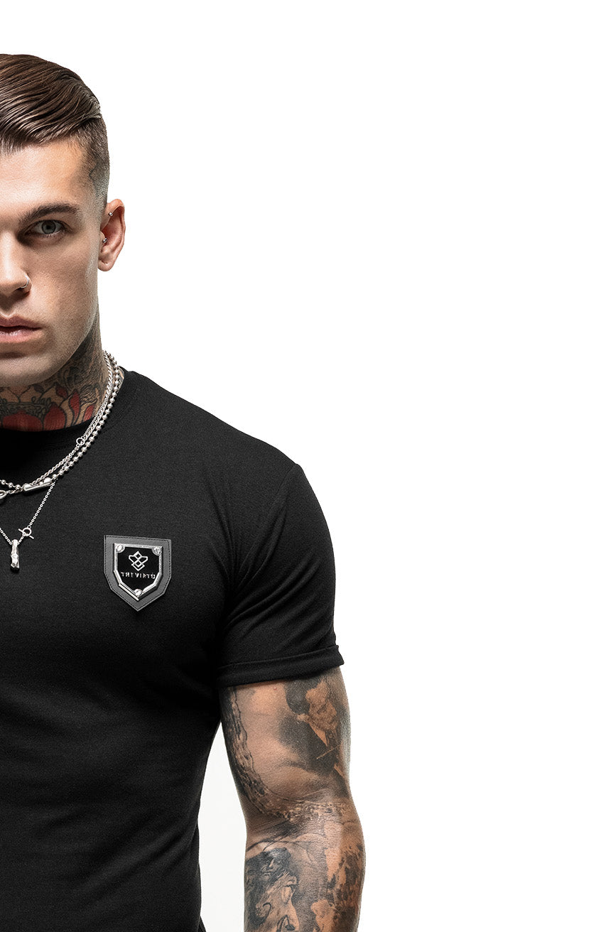 Una stampa grafica unica di un lupo feroce con malvagi occhi rossi, impreziosita da oltre 7000 strass applicati a mano, caratterizza il retro di questa t-shirt in morbidissimo cotone di bambù. L'iconico stemma Virtu è centrale nel design stesso e compare anche sullo scudo in pelle sul petto a sinistra.