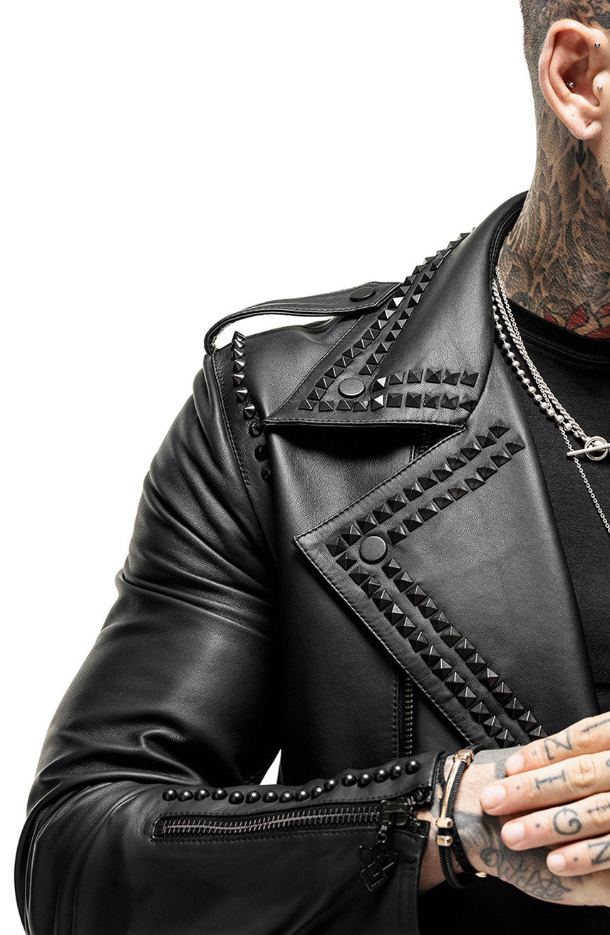 Realizzata in morbidissima pelle di agnello, presenta borchie in metallo nero applicate a mano per un look iconico. Il logo VIRTU è impresso al centro del retro, con cerniere in metallo con logo tagliate al laser su tutte le chiusure. L'interno presenta una fodera stampata all-over.